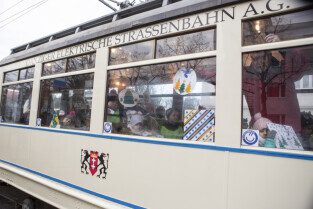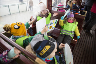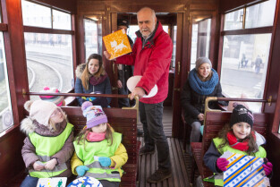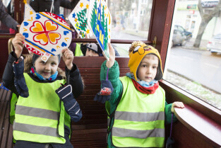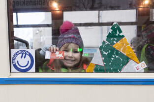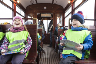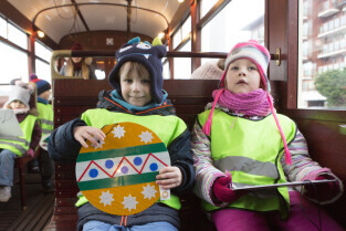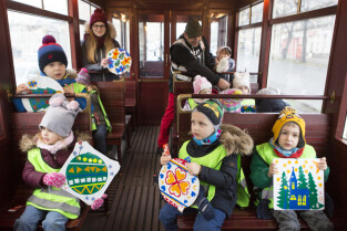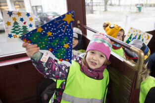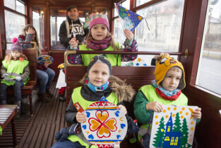 Dzieci z przedszkola Biały Kotek podczas przejazdu świątecznym zabytkowym tramwajem RING z 1930 roku. Wycieczka jest nagrodą w konkursie Odblaskowa Bombka