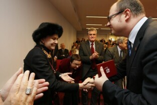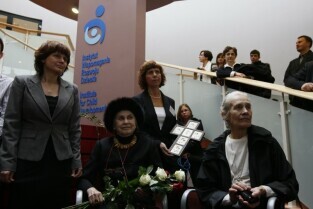 Otwarcie Przedszkola Specjalnego dla Dzieci z Autyzmem przy ul. Malczewskiego 139 w Gdańsku. Fundatorem placówki jest Barbara Piasecka-Johnson. Nz. Prezydent Gdańska Paweł Adamowicz wręcza Medal XX-lecia Samorządności