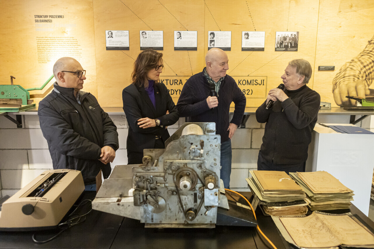 Gdańsk. w Europejskim Centrum Solidarności odbyło się przekazanie maszyny offsetowej przez marszałka Bogdana Borusewicza, posła Jerzego Borowczaka i konstruktora Ryszarda Pusza. W uroczystości wzięła również udział Magdalena Mistat, p.o. dyrektor ECS.