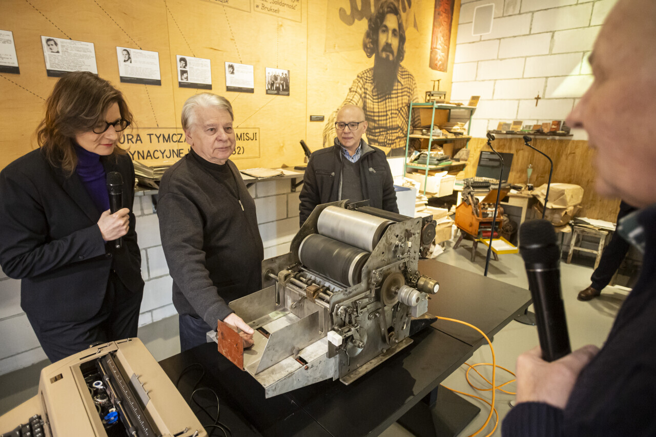 Gdańsk. w Europejskim Centrum Solidarności odbyło się przekazanie maszyny offsetowej przez marszałka Bogdana Borusewicza, posła Jerzego Borowczaka i konstruktora Ryszarda Pusza. W uroczystości wzięła również udział Magdalena Mistat, p.o. dyrektor ECS.