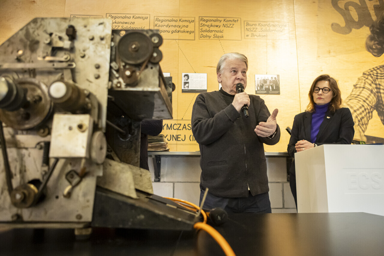 Gdańsk. w Europejskim Centrum Solidarności odbyło się przekazanie maszyny offsetowej przez marszałka Bogdana Borusewicza, posła Jerzego Borowczaka i konstruktora Ryszarda Pusza. W uroczystości wzięła również udział Magdalena Mistat, p.o. dyrektor ECS.