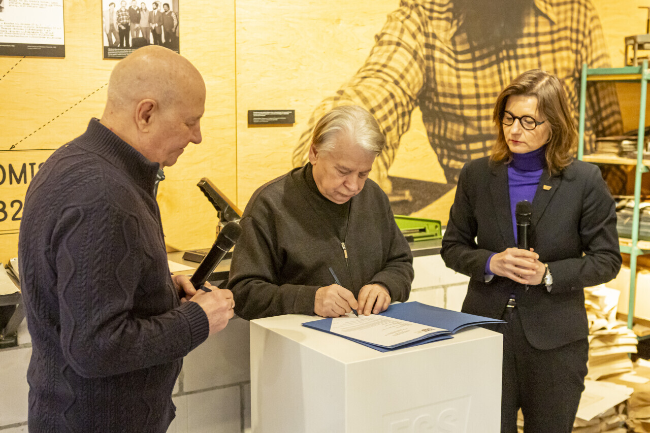 Gdańsk. w Europejskim Centrum Solidarności odbyło się przekazanie maszyny offsetowej przez marszałka Bogdana Borusewicza, posła Jerzego Borowczaka i konstruktora Ryszarda Pusza. W uroczystości wzięła również udział Magdalena Mistat, p.o. dyrektor ECS.