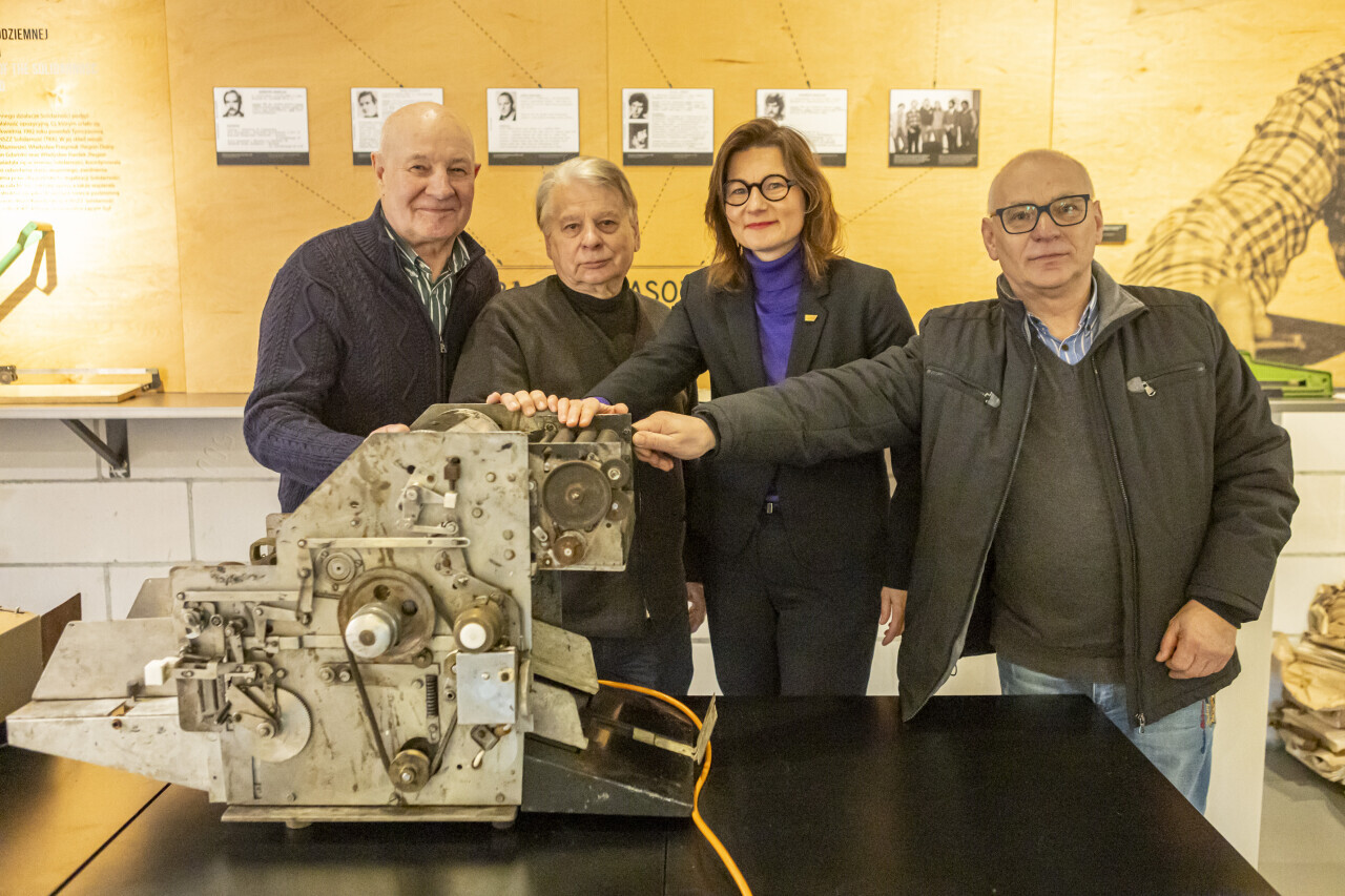 Gdańsk. w Europejskim Centrum Solidarności odbyło się przekazanie maszyny offsetowej przez marszałka Bogdana Borusewicza, posła Jerzego Borowczaka i konstruktora Ryszarda Pusza. W uroczystości wzięła również udział Magdalena Mistat, p.o. dyrektor ECS.