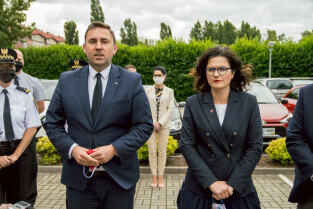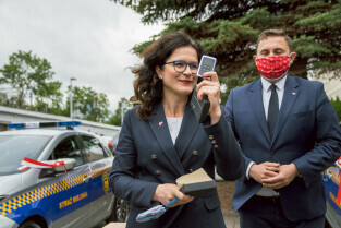 Gdańsk, ul. Biała, Referat Ekologiczny Straży Miejskiej. Przekazanie pojazdów elektrycznych dla Straży Miejskiej. Nz. wiceprezydent Piotr Borawski i Prezydent Gdańska Aleksandra Dulkiewicz