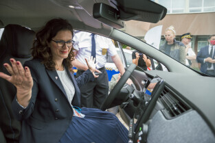Gdańsk, ul. Biała, Referat Ekologiczny Straży Miejskiej. Przekazanie pojazdów elektrycznych dla Straży Miejskiej. Nz. Prezydent Gdańska Aleksandra Dulkiewicz i wiceprezydent Piotr Borawski
