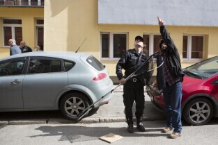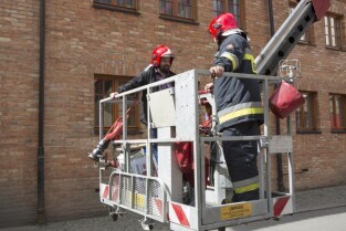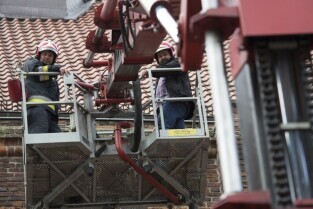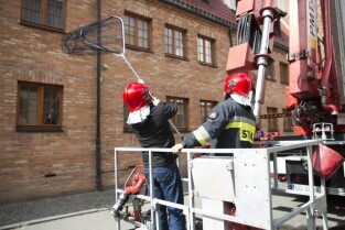 Akcja ewakuacji kaczki krzyżówki wraz z nowo narodzonymi kaczątkami z poddasza Kościoła Św. Trójcy w Gdańsku. Nz. od lewej: Jakub Tybiak i Szymon Bzoma (Gdański Animals TPZ)