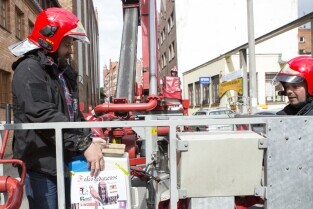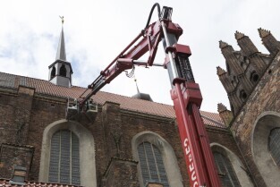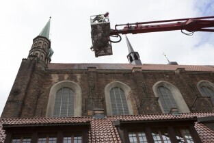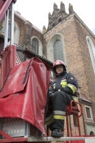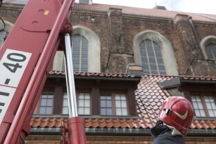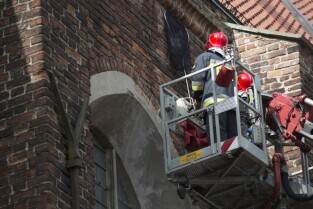 Akcja ewakuacji kaczki krzyżówki wraz z nowo narodzonymi kaczątkami z poddasza Kościoła Św. Trójcy w Gdańsku. Nz. Szymon Bzoma (Gdański Animals TPZ)