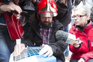 Akcja ewakuacji kaczki krzyżówki wraz z nowo narodzonymi kaczątkami z poddasza Kościoła Św. Trójcy w Gdańsku. Nz. po lewej Szymon Bzoma (Gdański Animals TPZ)