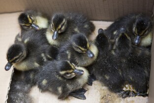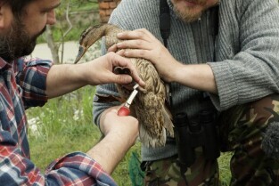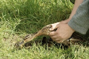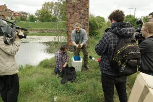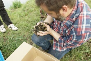 Akcja ewakuacji kaczki krzyżówki wraz z nowo narodzonymi kaczątkami z poddasza Kościoła Św. Trójcy w Gdańsku. Nz. obrączkowanie i wypuszczanie kaczek na Opływie Motławy