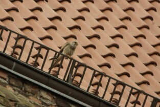 Akcja ewakuacji kaczki krzyżówki wraz z nowo narodzonymi kaczątkami z poddasza Kościoła Św. Trójcy w Gdańsku. Nz. pustułka „czyhająca" na łatwą zdobycz