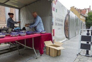 Gdańsk. Trwają ostatnie przygotowania do tegorocznej, 760 odsłony Jarmarku św.Dominika. NZ. Pani Agnieszka Dolota z Ożarowa Mazowieckiego wraz z synem przygotowują stoisko z rękodziełem.