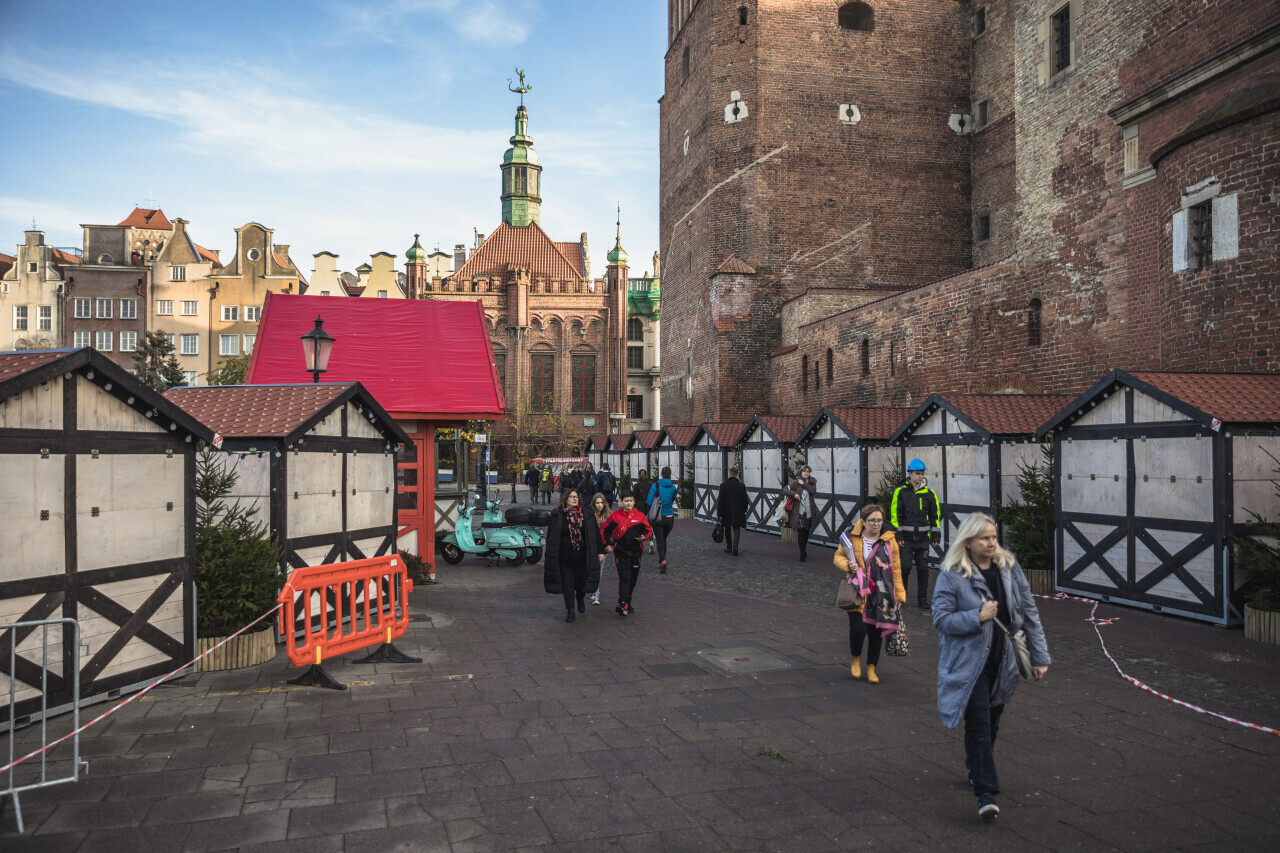 Gdańsk, ul. Targ Węglowy i okolice. Przygotowania do jarmarku bożonarodzeniowego