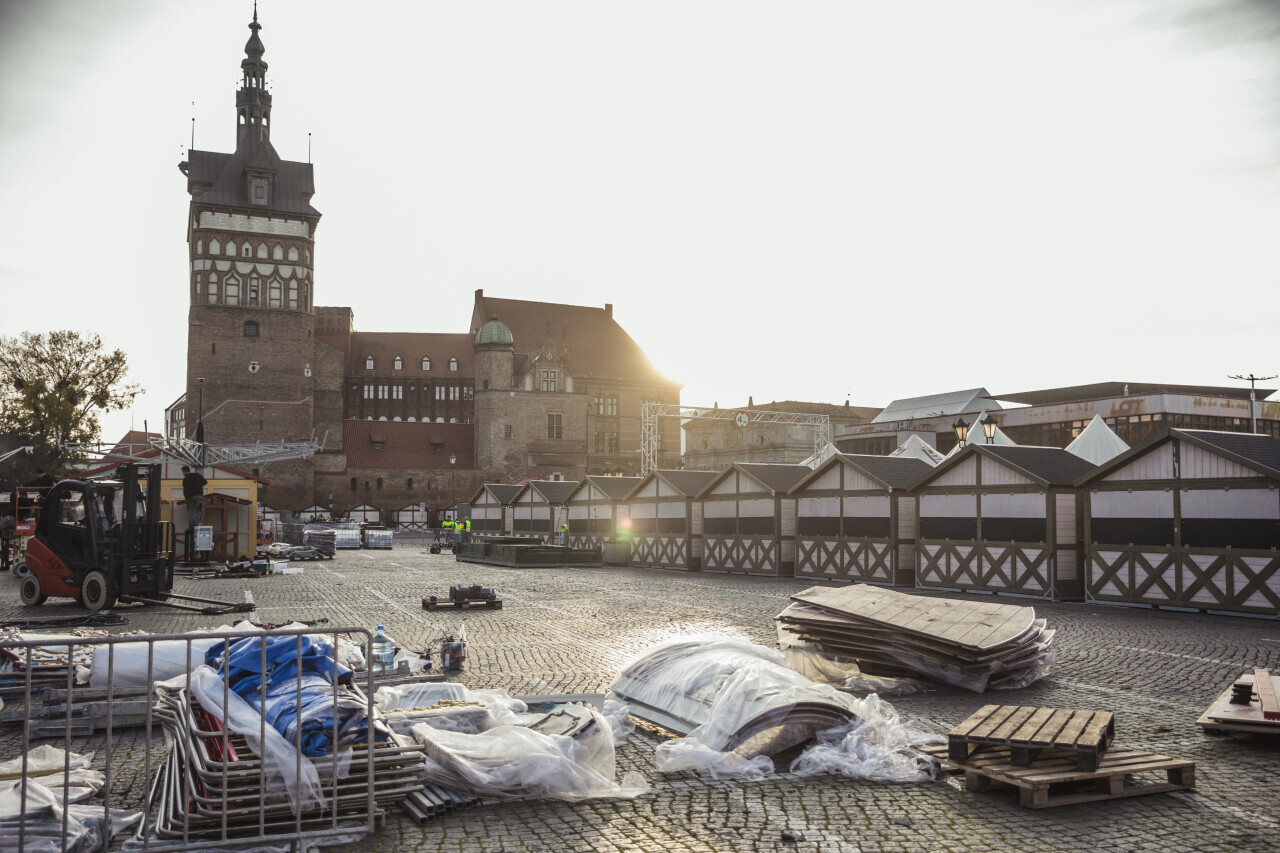 Gdańsk, ul. Targ Węglowy i okolice. Przygotowania do jarmarku bożonarodzeniowego