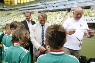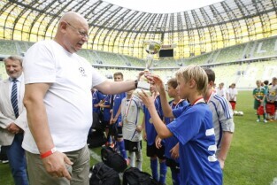 PGE Arena, Gdańsk Letnica. VII edycja turnieju piłkarskiego drużyn 12-latków z powiatów woj. pomorskiego "Przystanek Euro 2013". Nz. wręczenie nagród, którego dokonali: Dyrektor Biura ds. Sportu Prezydenta Gdańska Andrzej Trojanowski, Przewodniczący Gdańskiej Rady Sportu Wojciech Przybylski, Prezes Pomorskiego Związku Piłki Nożnej Radosław Michalski