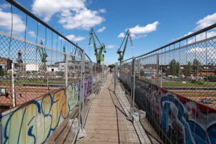 Gdańsk. Przystanek SKM Gdańsk Stocznia i kładka dla pieszych.