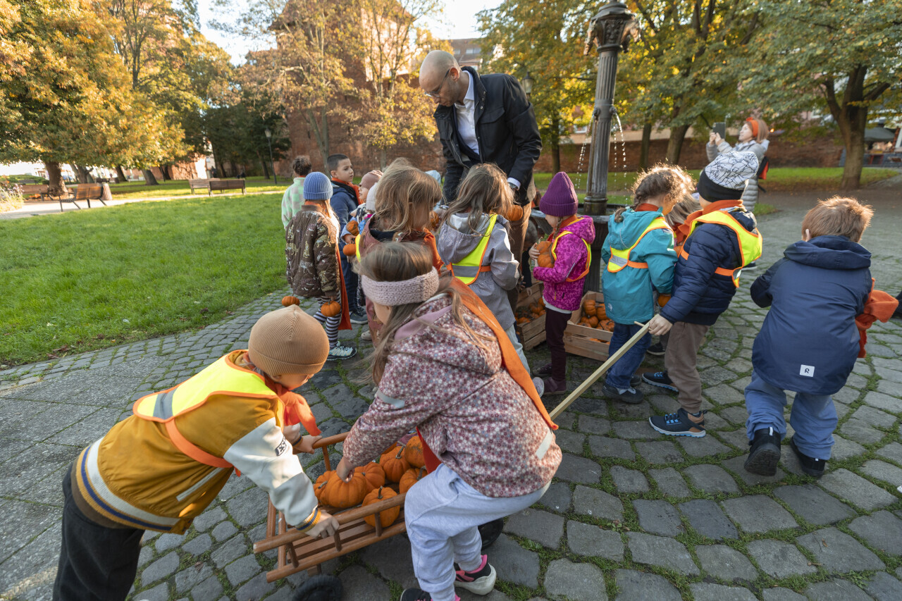 Gdańsk. Przystrajanie Placu Kobzdeja dyniami.