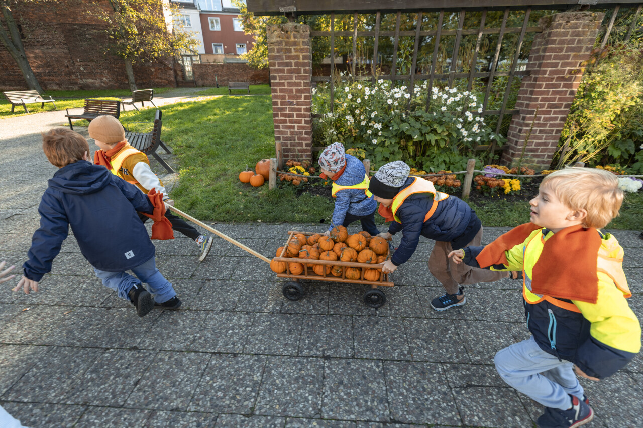 Gdańsk. Przystrajanie Placu Kobzdeja dyniami.