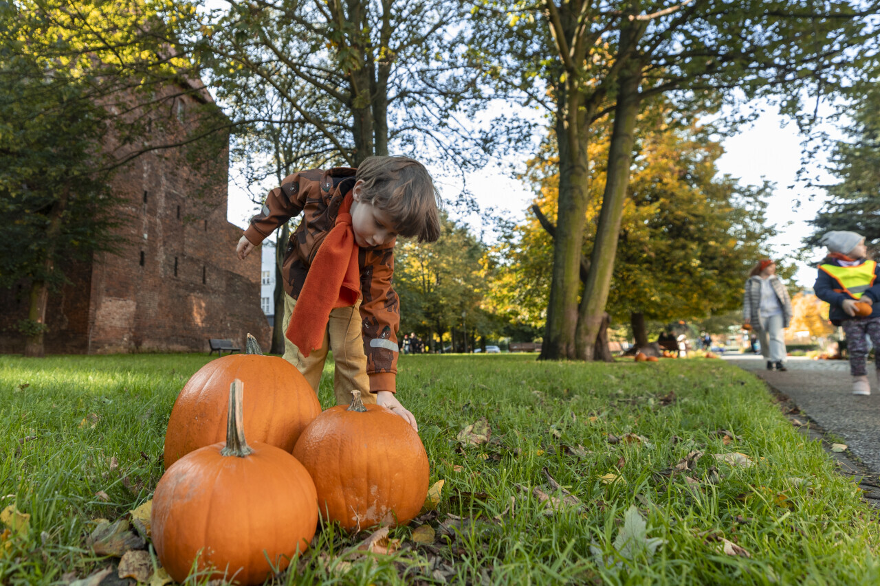 Gdańsk. Przystrajanie Placu Kobzdeja dyniami.