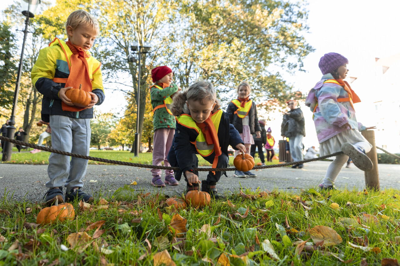 Gdańsk. Przystrajanie Placu Kobzdeja dyniami.
