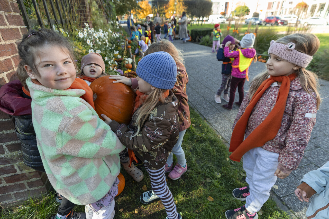Gdańsk. Przystrajanie Placu Kobzdeja dyniami.