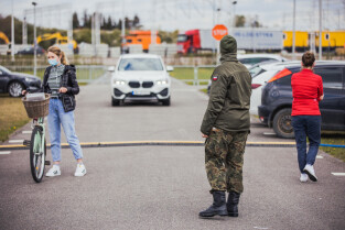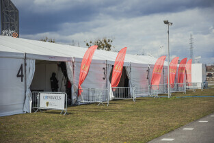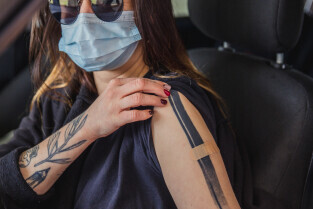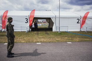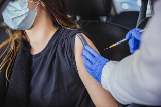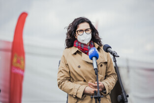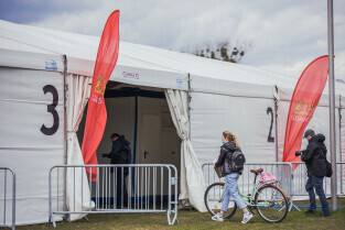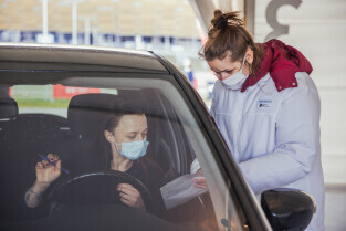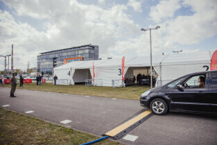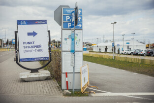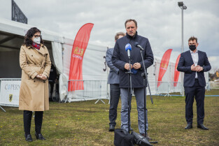 Gdańsk. Punktu Szczepień Drive Thru na parkingu Stadionu Gdańsk. W briefingu udział wzięli Mieczysław Struk, Marszałek Województwa Pomorskiego; Aleksandra Dulkiewicz, prezydent Gdańska; Dariusz Kostrzewa, prezes zarządu Spółki COPERNICUS oraz Paweł Buczyński, prezes Arena Gdańsk Operator