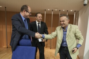 Urząd Marszałkowski Woj. Pomorskiego w Gdańsku. Posiedzenie Rady Metropolitalnej Zatoki Gdańskiej. Nz. Prezydent Gdańska Paweł Adamowicz (po lewej) i Prezydent Gdyni Wojciech Szczurek, z tyłu Marszałek Woj. Pomorskiego Mieczysław Struk
