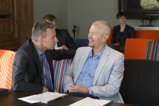 Inauguracje posiedzenie Rady Programowej Obszaru Metropolitalnego Gdańsk-Gdynia-Sopot. Gdańsk, Olivia Business Centre. Nz. Prezes Portu Lotniczego Gdańsk Tomasz Kloskowski i Redaktor Naczelny Trojmiasto.pl Michał Kaczorowski