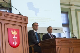 Posiedzenie Rady Związku Zintegrowanych Inwestycji Terytorialnych. Gdańsk, Nowy Ratusz. Nz. Prezydent Gdyni Wojciech Szczurek i Wiceprezydent Gdyni Michał Guć