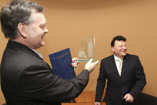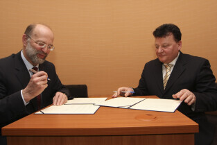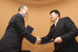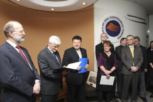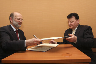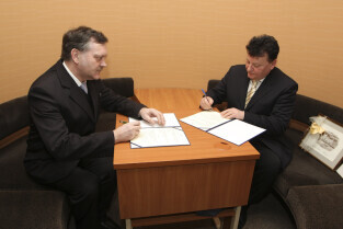 Regionalna Izba Gospodarcza Pomorza - otwarcie siedziby przy ul. Dyrekcyjnej. Nz. umowę o współpracy podpisują (od lewej): Henryk Krawczyk (rektor Politechniki Gdańskiej) i Janusz Baran (prezes RIGP)