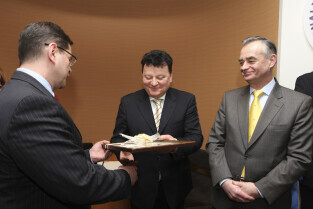 Regionalna Izba Gospodarcza Pomorza - otwarcie siedziby przy ul. Dyrekcyjnej. Nz. od lewej: Zbigniew Canowiecki (wiceprzewodniczący RIGP), Paweł Adamowicz (Prezydent Gdańska), Jan Kozłowski (Marszałek Pomorski)