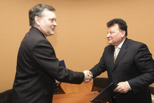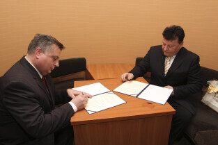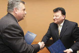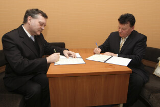 Regionalna Izba Gospodarcza Pomorza - otwarcie siedziby przy ul. Dyrekcyjnej. Nz. umowę o współpracy podpisują (od lewej): Janusz Gierulski (Elbląska Izba Gospodarcza) i Janusz Baran (prezes RIGP)