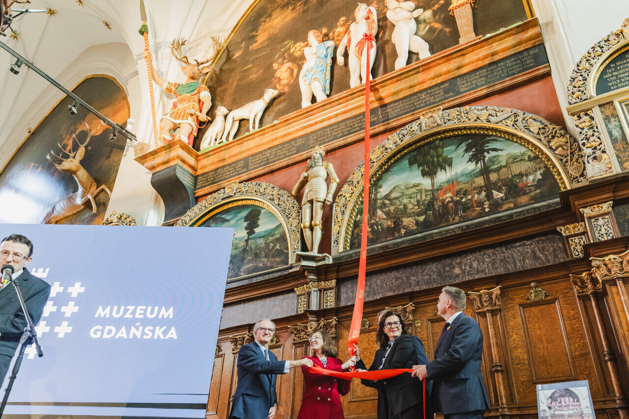 Gdańsk, Dwór Artusa. Rekonstrukcja grupy rzeźbiarskiej Kąpiel Diany. W wydarzeniu, brali udział: Karl-Matthias Klause, Konsul Generalny RFN w Gdańsku, Aleksandra Dulkiewicz, prezydent Gdańska, Waldemar Ossowski, dyrektor Muzeum Gdańska, Izabela Jastrzembska-Olkowska, kierowniczka Dworu Artusa, Muzeum Gdańska, Andre Esperling, przedstawiciel Bractw Ław Gdańskiego Dworu Artusa w Lubece