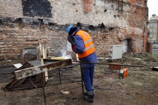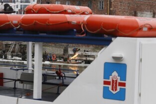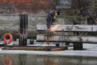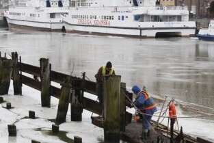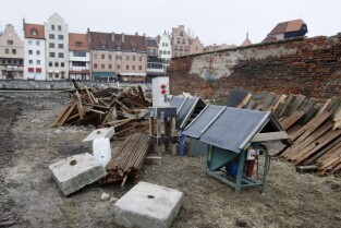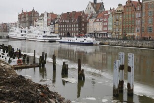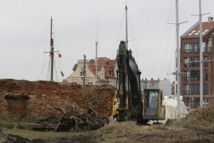 Prace rozbiórkowe starych nabrzeży Motławy w Gdańsku zlokalizowanych na terenie północnego cypla Wyspy Spichrzów