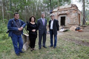 Sulmin, gm. Kolbudy. Renowacja na zlecenie gmin Gdańsk i Żukowo XIX wiecznego grobowca zasłużonej dla Gdańska rodziny Gralathów wraz z otaczającym go cmentarzem. Nz. od lewej: przedstawiciel wykonawcy Jarosław Graban (Polskie Pracownie Konserwacji Zabytków S.A.), Sołtys Sulmina Lidia Cendrowska, Zastępca Burmistrza Gminy Żukowa Marek Trepczyk, Miejski Konserwator Zabytków w Gdańsku Janusz Tarnacki