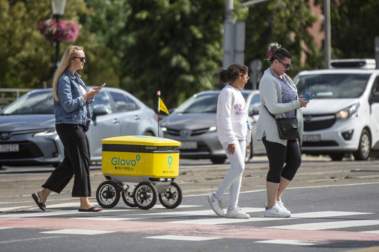 Gdańsk. Autonomiczny robot używany przez firmę Glovo przejeżdża przez przejście dla pieszych na ulicy Hucisko.