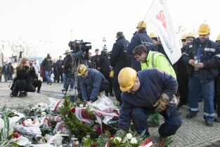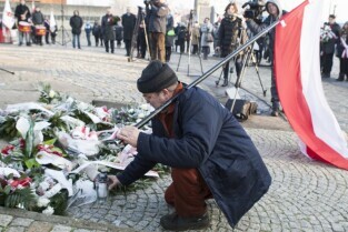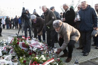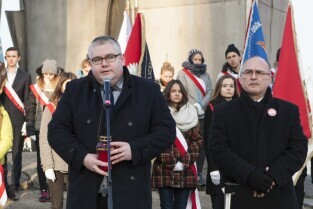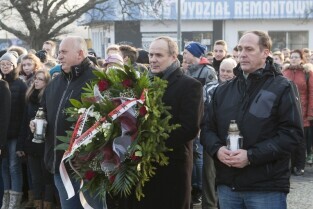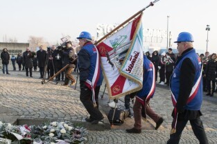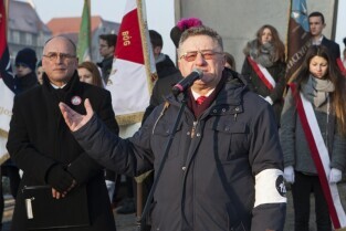 Gdańsk, Plac Solidarności. Obchody 45. rocznicy wydarzeń w Grudniu 1970 r. z udziałem młodzieży i pracowników Stoczni Gdańskiej. Nz. Z-ca Prezydenta Gdańska Piotr Kowalczuk