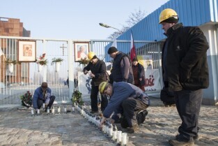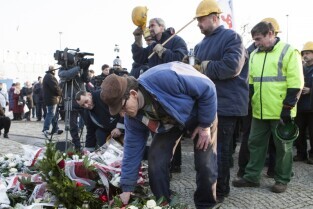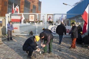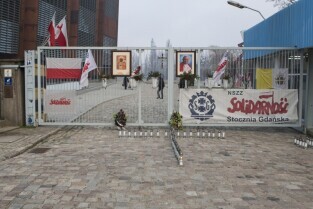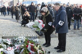 Gdańsk, Plac Solidarności. Obchody 45. rocznicy wydarzeń w Grudniu 1970 r. z udziałem młodzieży i pracowników Stoczni Gdańskiej