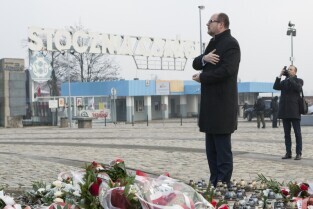 Gdańsk, Plac Solidarności. Obchody 45. rocznicy wydarzeń w Grudniu 1970 r. z udziałem młodzieży i pracowników Stoczni Gdańskiej. Nz. Prezydent Gdańska Paweł Adamowicz