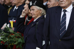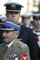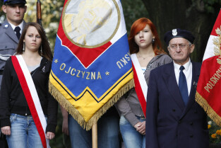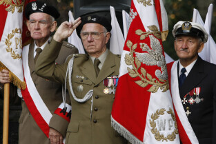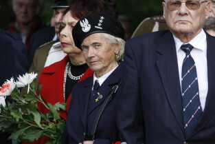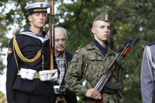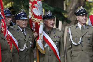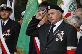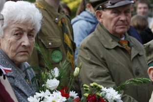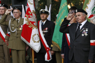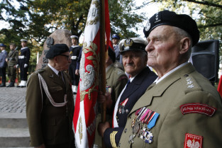 Rocznica Powstania Polskiego Państwa Podziemne i Szarych Szeregów. Gdańsk, Targ Rakowy, pomnik Polskiego Państwa Podziemnego. Nz. kombatanci