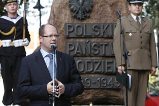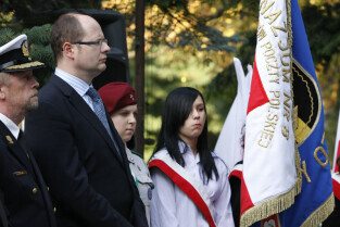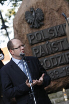 Rocznica Powstania Polskiego Państwa Podziemne i Szarych Szeregów. Gdańsk, Targ Rakowy, pomnik Polskiego Państwa Podziemnego. Nz. Paweł Adamowicz