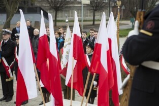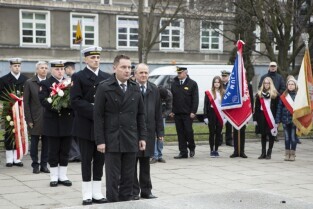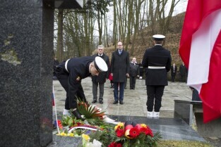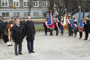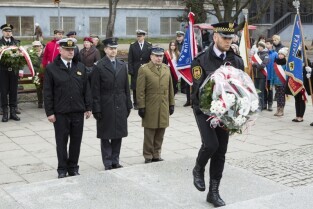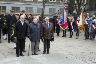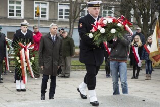 Gdańsk, Podwale Staromiejskie, pomnik "Tym Co Za Polskość Gdańska". Obchody 70. rocznicy "Powrotu Gdańska do Macierzy". Nz. Wicewojewoda Pomorski Michał Owczarczak