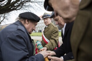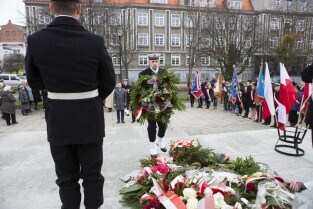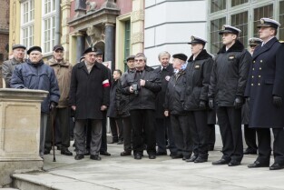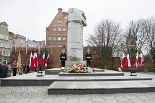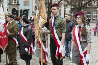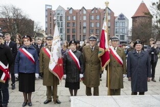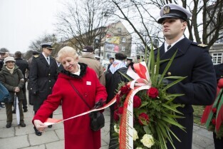 Gdańsk, Podwale Staromiejskie, pomnik "Tym Co Za Polskość Gdańska". Obchody 70. rocznicy "Powrotu Gdańska do Macierzy"