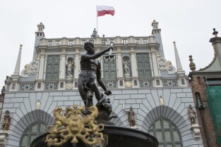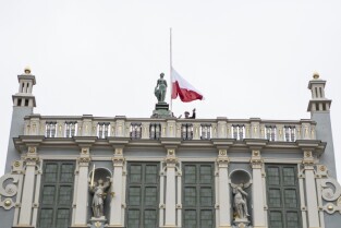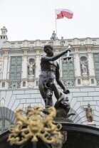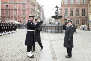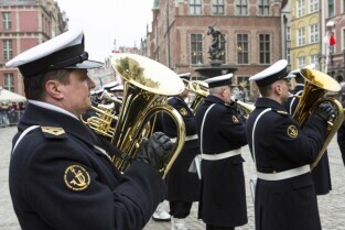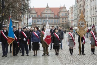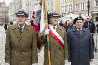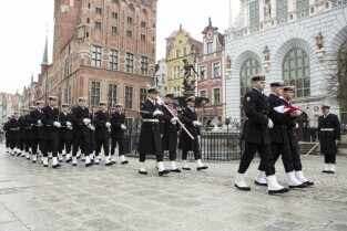 Gdańsk, Długi Targ. Obchody rocznicy "Powrotu Gdańska do Macierzy". 70. rocznica zawieszenia biało - czerwonego sztandaru na Dworze Artusa