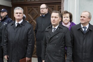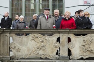 Gdańsk, Długi Targ. Obchody rocznicy "Powrotu Gdańska do Macierzy". 70. rocznica zawieszenia biało - czerwonego sztandaru na Dworze Artusa. Nz. od lewej: Przewodniczący Rady Miasta Gdańska Bogdan Oleszek, Prezydent Gdańska Paweł Adamowicz, Wicewojewoda Pomorski Michał Owczarczak, Wicemarszałek Woj. Pomorskiego Hanna Zych-Cisoń