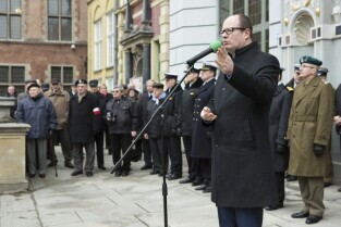 Gdańsk, Długi Targ. Obchody rocznicy "Powrotu Gdańska do Macierzy". 70. rocznica zawieszenia biało - czerwonego sztandaru na Dworze Artusa. Nz. Prezydent Gdańska Paweł Adamowicz