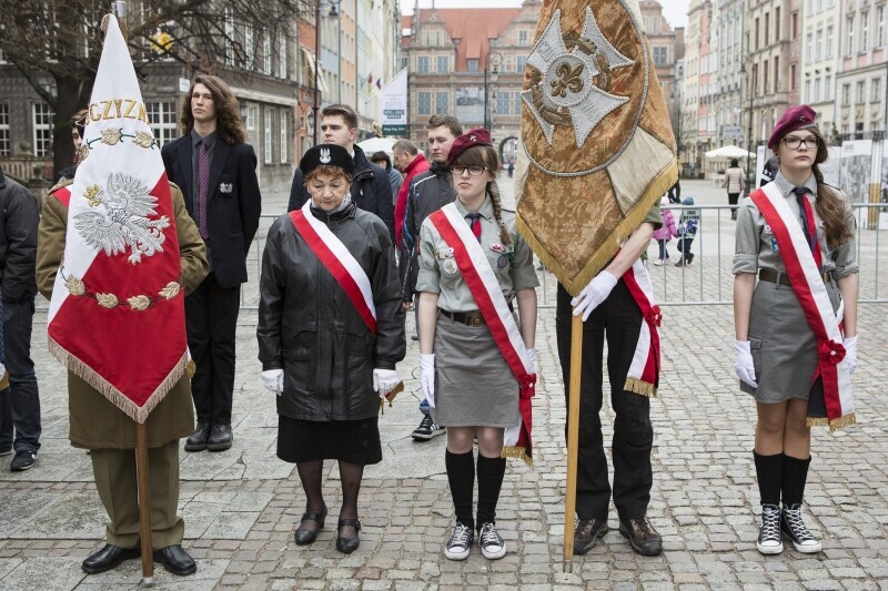 Gdańsk, Długi Targ. Obchody rocznicy "Powrotu Gdańska do Macierzy". 70. rocznica zawieszenia biało - czerwonego sztandaru na Dworze Artusa