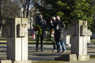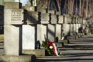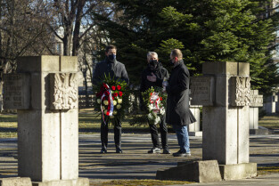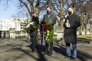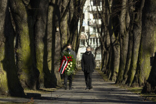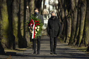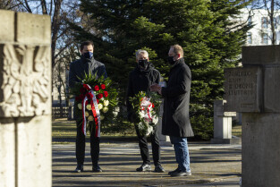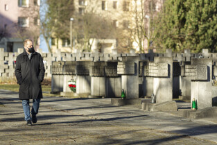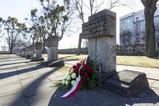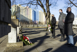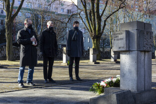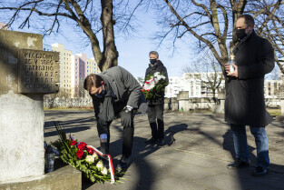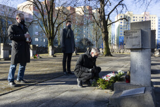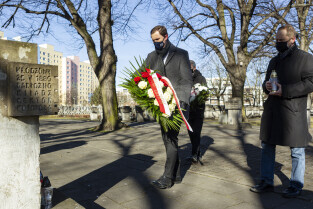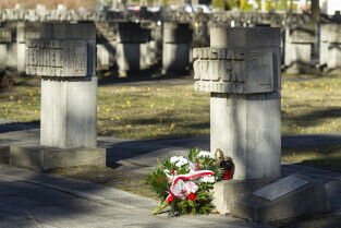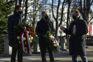 Gdańsk. Cmentarz Ofiar Hitleryzmu na Zaspie. W rocznicę egzekucji polskich działaczy w Wolnym Mieście Gdańsku, Zastępca Prezydenta Gdańska Piotr Grzelak w towarzystwie z-cy dyrektora Muzeum Gdańska Janusza Marszalca oraz kierownika Muzeum Poczty Polskiej Marka Adamowicza, złożył wieniece na grobach rozstrzelanych - Bronisława Komorowskiego i Michała Szucy.