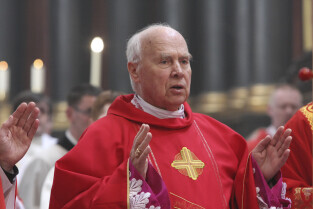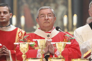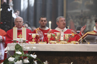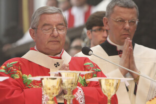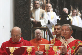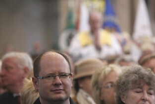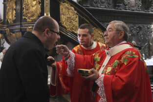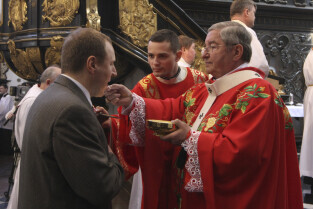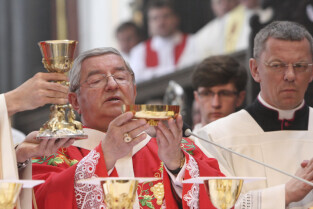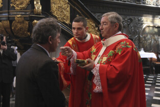 Gdańsk, Katedra Oliwska. Metropolita Gdański Arcybiskup Sławoj Leszek Głód - pierwsza rocznica ingresu. Nz. komunię otrzymuje Poseł RP Jacek Kurski