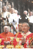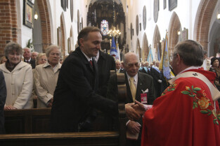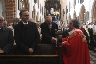 Gdańsk, Katedra Oliwska. Metropolita Gdański Arcybiskup Sławoj Leszek Głód - pierwsza rocznica ingresu. Nz. komunię otrzymuje Wojewoda Pomorski Roman Zaborowski