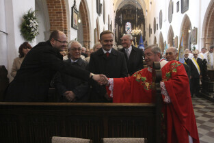 Gdańsk, Katedra Oliwska. Metropolita Gdański Arcybiskup Sławoj Leszek Głód - pierwsza rocznica ingresu. Nz. Arcybiskup Głód przekazuje znak pokoju Prezydentowi Gdyni Wojciechowi Szczurkowi